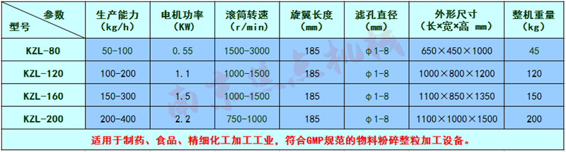 一、簡介 KZL系列粉碎整粒機適用于制藥、食品、精細化工加工工業(yè),符合GMP規(guī)范的物料粉碎整粒加工設備。本機全部采用不銹鋼材料制造。 四、型號參數